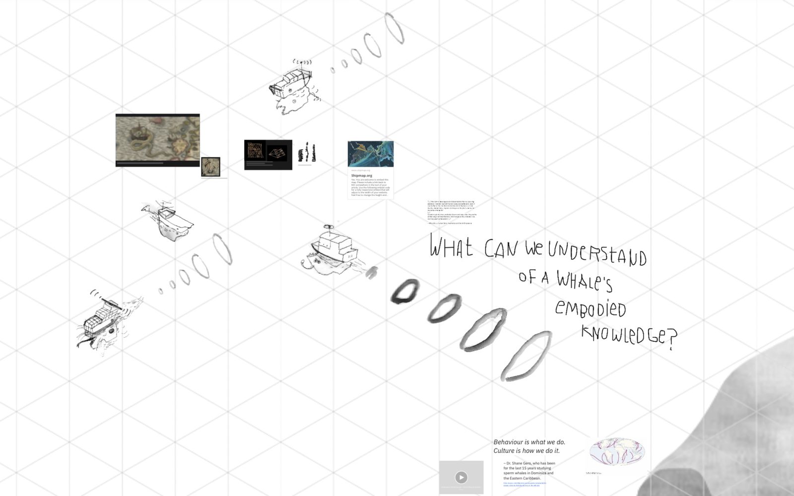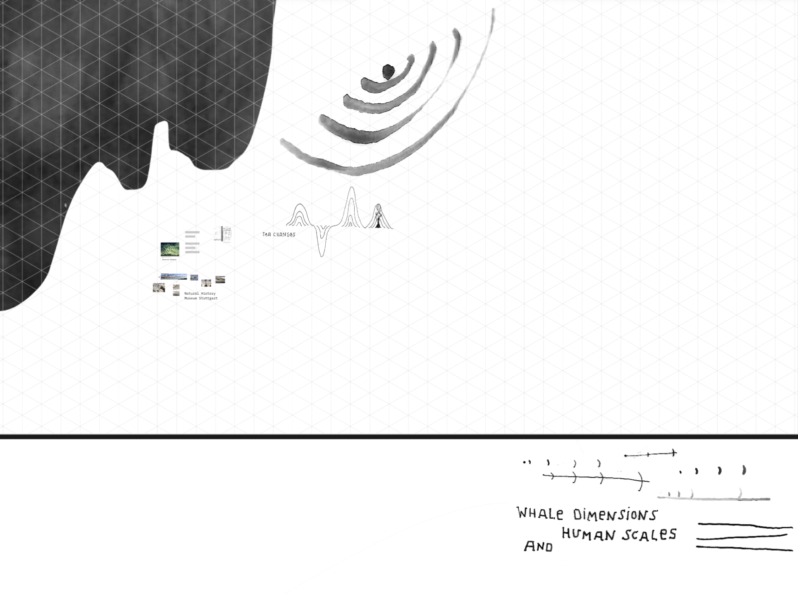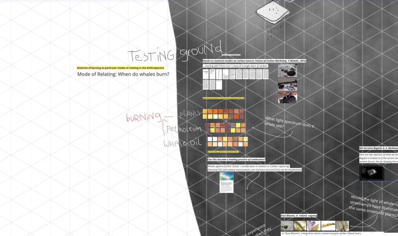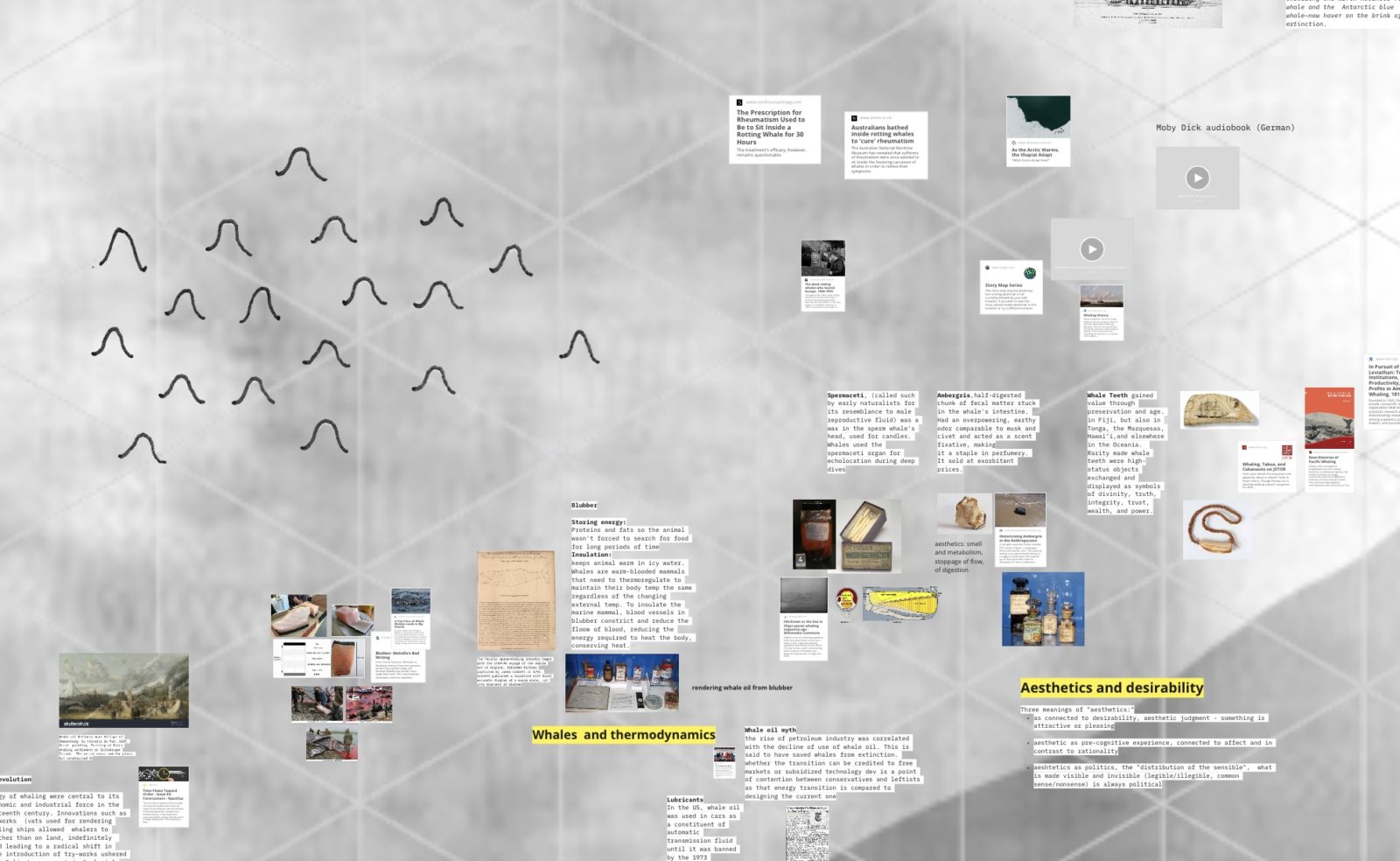 Inspired by Myriel Milicevic’s proposed research project on whales, the Carbon Aesthetics group positions whales as “boundary objects” that lay the foundations for a multi-disciplinary, non-anthropocentric encounter with the world. In this encounter, human energy use, chemical histories, global economies, and processes of combustion can be considered in a way that centers a non-human body or bodies. The group’s discussions brought together a broad spectrum of ideas, ranging from Milicevic’s interest in studies that frame whales as carbon sinks and the challenges of representing non-human perspectives, to Toland’s coming to terms with the legacies of whaling histories in her hometown of Boston and neighboring New Bedford and Cape Cod, Winkler’s suggestion of burning as relationality, Burbano’s experience of whale watching on the Pacific coast of Colombia, Foerster’s focus on aesthetics as aisthesis, and Sobecka’s interest in the place of whales in circulations of matter and as imaginaries. Visual and auditory references were collected iteratively on a Miro board that charts the dimensions of whales in vast ocean space and time spans that are impossible to compare to human scales. Accompanied by this chart, the following text is a reflection on what we can learn from whales about “Carbon Aesthetics” as a more-than-human marker of the Anthropocene.