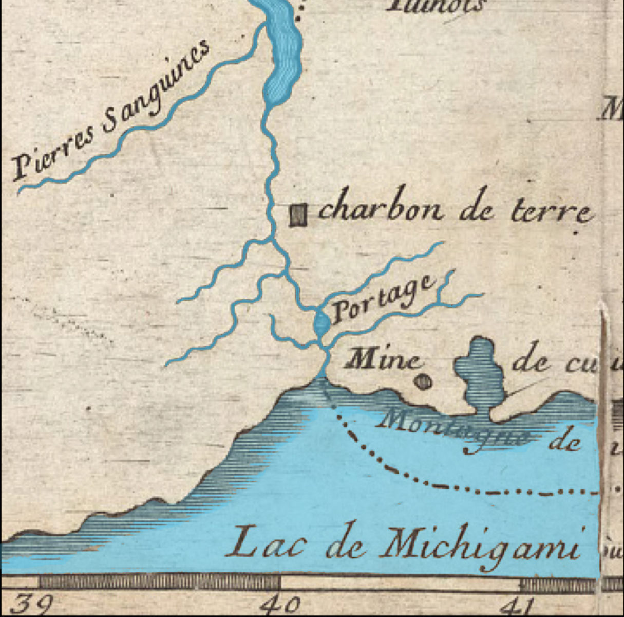 Map detail: The “discovery” of coal and the portage connecting the Gulf of Mexico to the North Atlantic mapped on Jolliet and Marquette’s journal map, just outside of present-day Chicago.