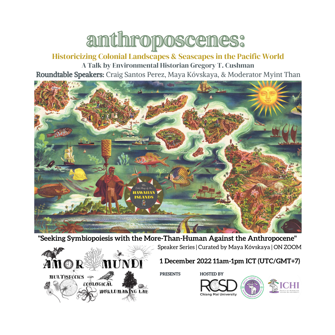 A talk by environmental historian Gregory T. Cushman and roundtable speaker discussion with Chamoru poet and scholar Craig Santos Perez and multispecies anthropocene scholar Maya Kóvskaya (AMOR MUNDI Multispecies Ecological Worldmaking Lab). Moderated by researcher Myint Than and followed by an audience Q&A.