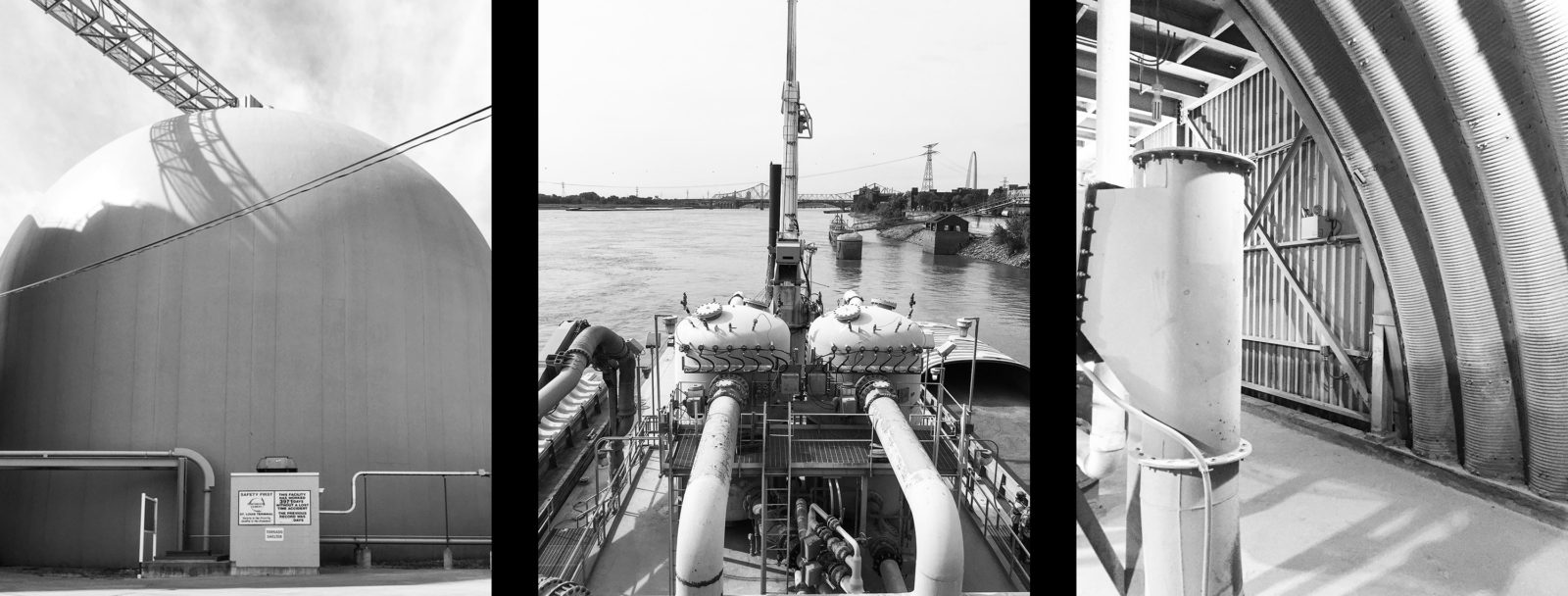 Territories—Watersheds—Infrastructures is a multi-scalar field documentation and mapping project that positions the Mississippi, its tributaries, and the St. Louis region within its broader watershed—particularly highlighting the complicated intersections of river management, industry and recreation. Multiple methods of field documentations will include photography and video from canoe trips on the river and aerial photography of various high- and low-water rivers stages. The work not only will be used to represent ideas, but also as objects of action for a set of dialogues about responsibility, agency, and possible futures for the Mississippi River Basin. Discussion, exhibition, and installations will all take place atop a working barge on the North Riverfront.