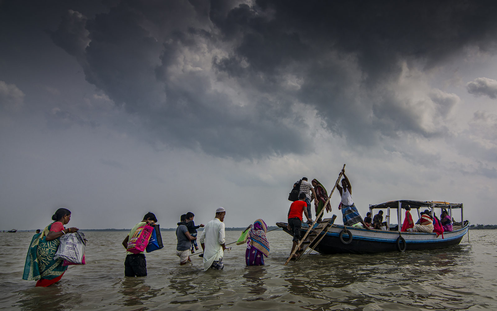 “Throughout history, humans have struggled for survival. Although we like to believe that life now offers semblances of comfort, progress remains limited to some parts of the world. In this photograph, people are wading through water that goes up to their knees: some carry luggage, others support their ailing family members, and yet others hoist their bicycles. It is a common scene in Achipur, West Bengal. The ferry is the only way around. Despite these many obstacles, they find peace and comfort in their lives, unlike much of the urban elite.”