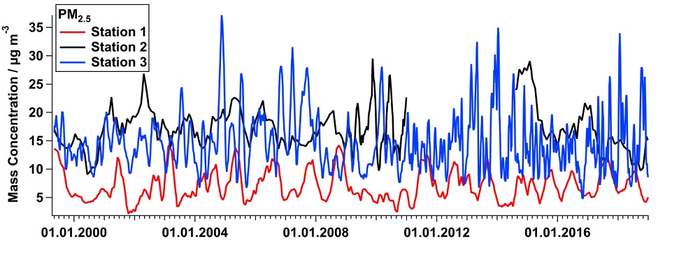 Figure 2: Weekly mass concentration of particulate matter below 2.5 µm particle diameter (PM2.5), measured at the three US-EPA air-quality stations indicated in Figure 1 Graph by Frank Drewnick using data downloaded from www.epa.gov Figure 1: US-EPA air-quality stations in the Mississippi River area. The exemplary data in Figure 2 are from the three marked stations Map data is courtesy of www.naturalearthdata.com