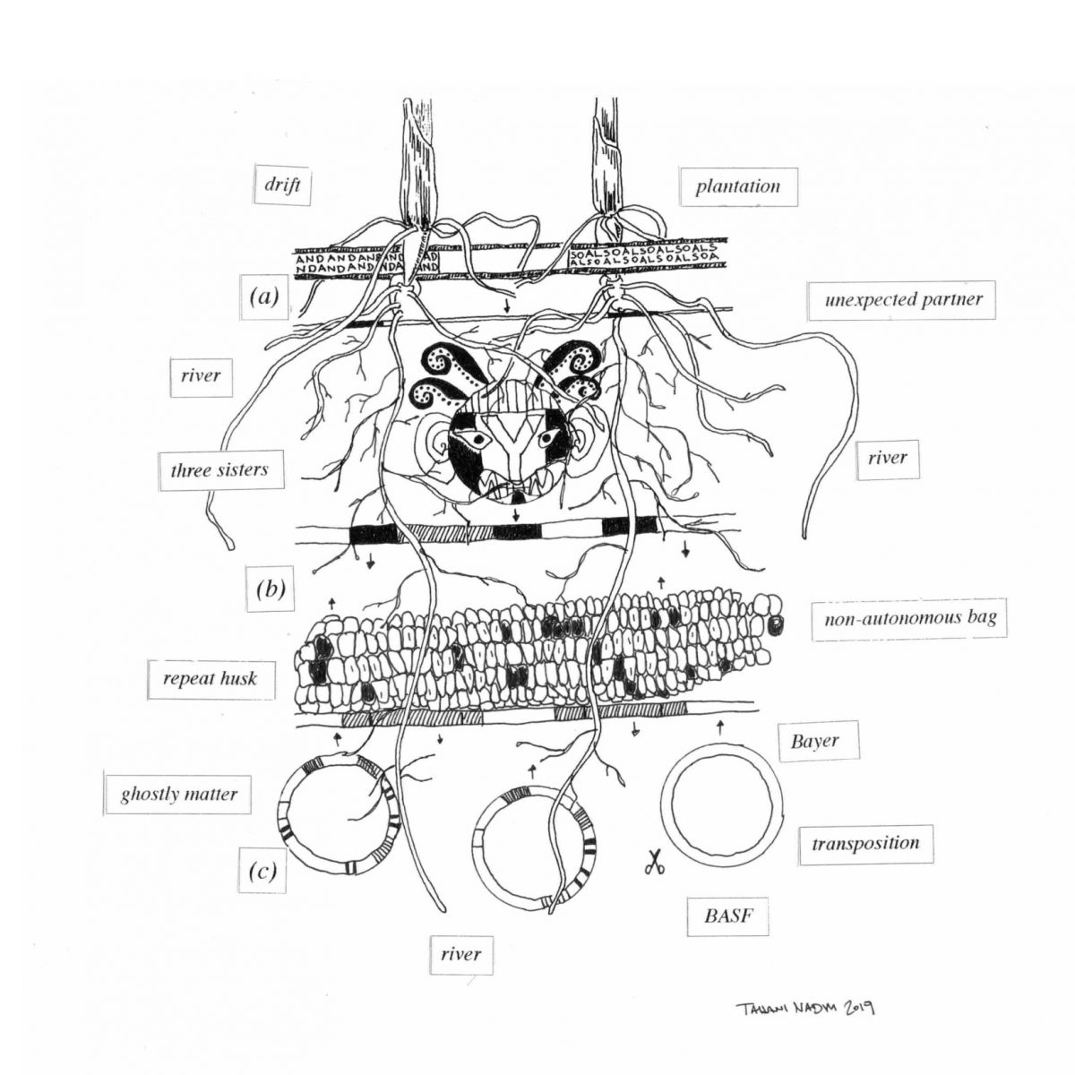 What can the archives of natural history tell us about genetically modified crops? How does a river divulge the geographies of marginalized? What might the rust on a combiner reel off about women’s health care? How do you read the biome through agrilogistics and vice versa? In other words, what stories contain the Anthropocene? By taking part in Mississippi. An Anthropocene River, I want to weave an experimental essay capacious enough for carrying multiple plots, plans, and plants. Put succinctly, I want to engage in what Donna Haraway, after Ursula Le Guin, calls “bag-lady story telling” that puts “unexpected partners and irreducible details into a frayed, porous carrier bag.”1 Concretely, I’m interested in maize (Zea mays) as a central model organism for the development of genomics and epigenetics, or epigenomics, and as a premier commodity crop. These figurations of maize are related. They have been radically reconfiguring human-environmental relations while mobilizing vast data machines that are intensifying ongoing expropriations and introducing novel types of extraction and concentration. At the same time, the lives of maize are cyclical and seasonal, recursively configuring socio-technical intimacies that cut across different times, both deep and human. Maize is thus a valiant companion for striking up “noninnocent conversations”2 with people and nonhuman worlds past and present. Specifically, maize lets me loop relations, from the Mississippi, to the Spree, to the Danube, and back; from speculative futures, to the Columbian Exchange, and back.