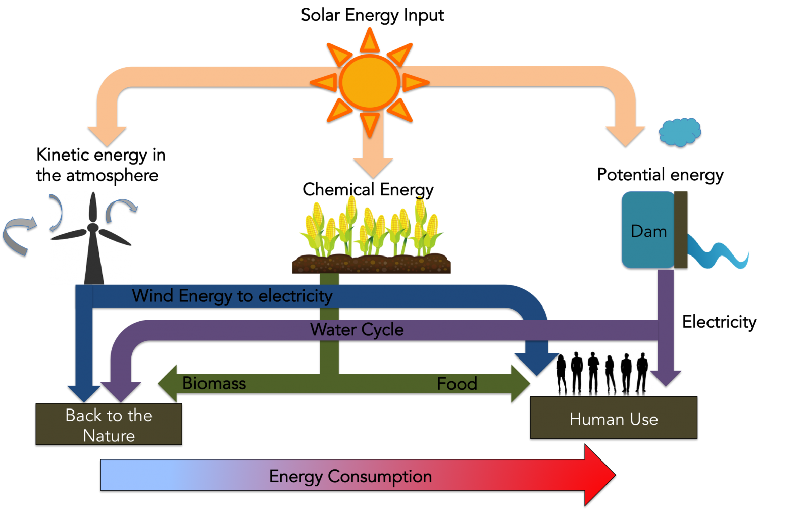 In this project, we aim to put numbers to the energy diversions in the Mississippi Basin and assess how they have likely changed over time. We plan to use spatial data sets of climatological variables, such as solar radiation, winds, and precipitation, in combination with land-cover maps to estimate two energy-conversion scenarios. The first scenario will consider a hypothetical natural state where no energy conversions are diverted to human use. Using this scenario as a reference, we will then reevaluate these conversions for present-day conditions using land-use statistics as well as statistics on wind energy and hydropower. This comparison should tell us the extent to which humans have diverted natural energy conversions. From this comparison, we should also be able to identify how much more energy could potentially be diverted for human use.