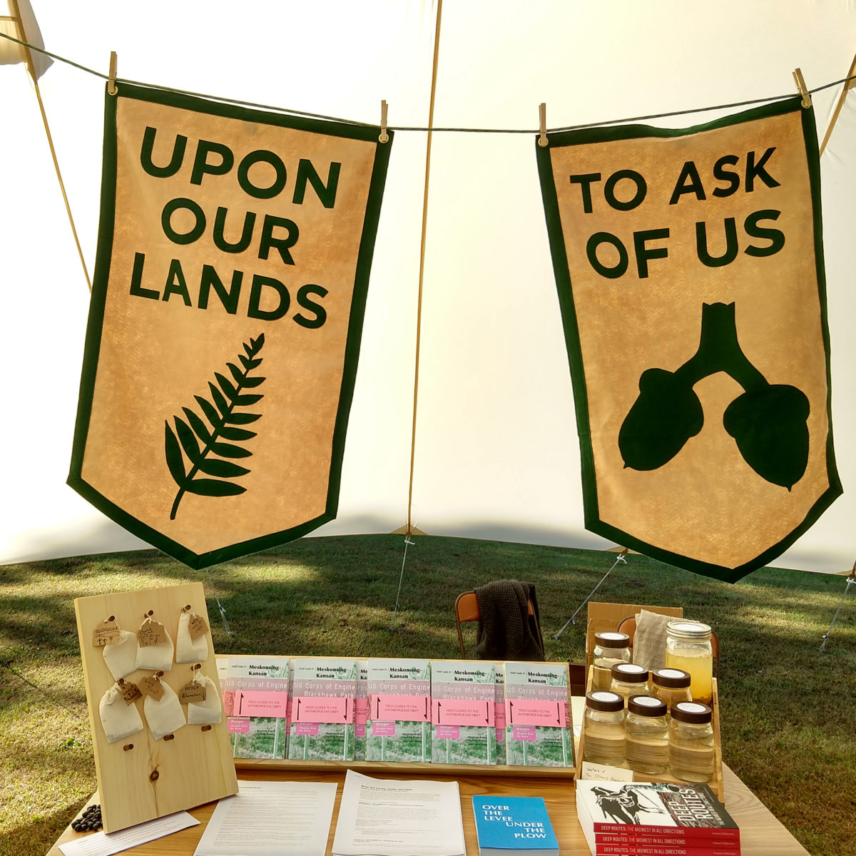 In its entirety, This Land is Always includes 18 felt-applique banners installed on copper pipes. Thirteen tan-and-green banners integrate medicinal and edible plants juxtaposed with fragmented text taken from a speech by Ogama Mdewé (Chief Metea, Potawatomi) against signing the Treaty of Chicago. This particular treaty was signed in Chicago (1821) and ceded nearly all remaining land south of the Chi-ziibing/Grand River, including the Land on which Kalamazoo College resides. Ogama Mdewé’s recorded oratory, which would have been given in Neshnabémwen, the Potawatomi language, demonstrates a fervent disagreement with ceding additional Land, as the Anishinaabe (Potawatomi, Odawa, and Ojibwe) had signed three previous treaties in 1807, 1817, and 1819.