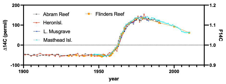 Druffel, Ellen R. M, and Sheila Griffin. 1995. “Regional Variability of Surface Ocean Radiocarbon from Southern Great Barrier Reef Corals.” Radiocarbon 37 (2): 517–24. https://doi.org/10.1017/S0033822200031003.
